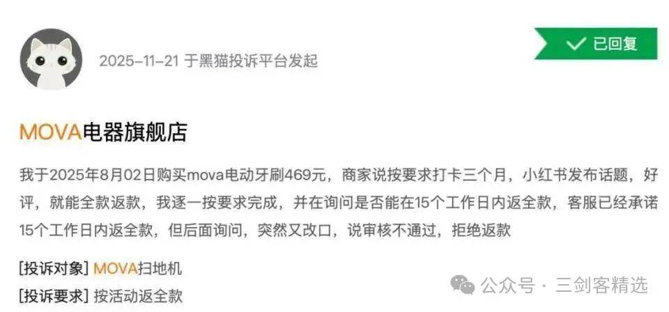 据凤凰网财经《公司研究院》报道,多位消费者反映,他们按照MOVA商家的要求,购买其电动牙刷或扫地机器人,并参与一项活动:商家承诺,若消费者在90天甚至100天内,每天坚持使用并通过App打卡,同时在社交平台(如小红书)发布指定内容的宣传笔记。商家客服在活动初期往往承诺,只要完成任务即可获得全额返款。