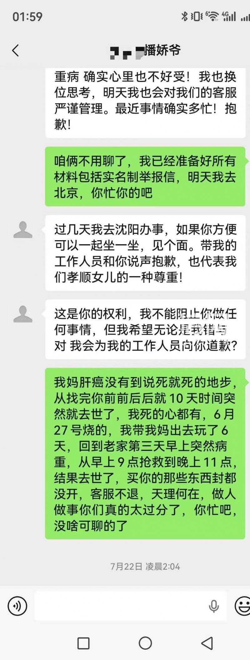 遗憾的是,吴先生的母亲并未因此“消灾解难”,收到“代烧”视频后十天,老人于7月7日经抢救无效去世。悲痛之余,吴先生向直播平台客服提出退货退款。遭到拒绝后,他将此事举报给了有关部门。此后,昵称“娇爷 撒个娇”的微信号向吴先生发来“慰问”,并转账2999元。吴先生拒收后,该微信还表示个人愿意将吴先生所有消费进行退还,“不够再补”,并表示可以代工作人员向他道歉,双方可以找时间“坐一坐,见个面”。被拒绝后,该账号将吴先生拉黑。