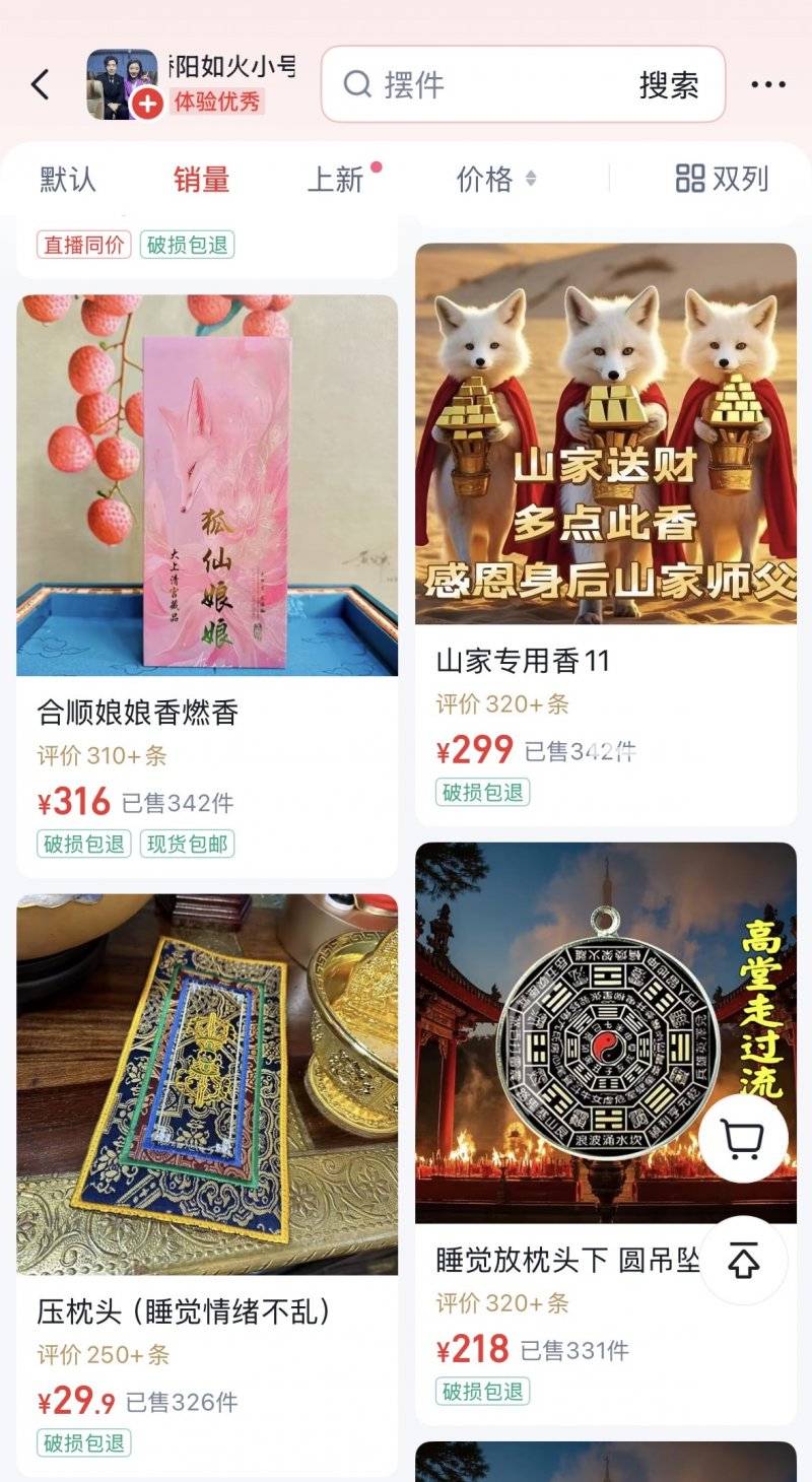 吴先生透露,在举报搜证过程中,他发现仅自己所在的长春市就有多位消费者在“娇娇”直播间下单此类产品,“大家的消费额从400余元到3000元不等,金额累计有几万元”。根据“娇娇”平台店铺展示的销售数据,其多款宣称具有“招米”“消灾”等功效的产品销量不俗,其中单价400元的“补横财”售出895件,单价29.9元的“撒门口摆件”售出4438件,目前部分相关产品仍在售卖。