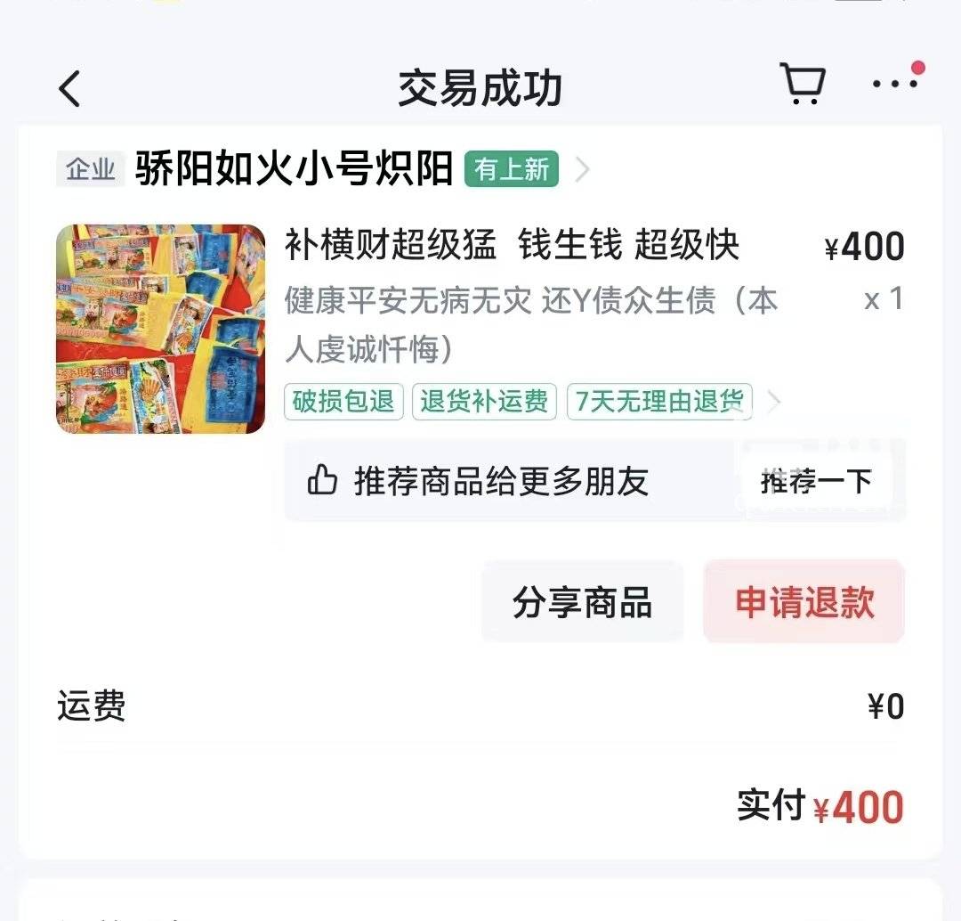 据吴先生介绍,今年6月,他的母亲查出肝癌,恰好那段时间他刷到网红“娇娇”推广“祈福信物”等内容的直播。视频里,“娇娇”声称自己售卖的商品可“招米(代指招财)、保平安、消灾解难”,其助理也在社交平台发布“咒符消灾的相关案例”。吴先生联系了“娇娇”及其助理咨询,被建议购买“祈福香”和两个“消灾解难包”,声称焚烧这些物品可为其母亲“减少痛苦”,他们会提供代焚烧服务并赠送“堕胎符”,吴先生为此累计支付了3248.4元。6月27日,“娇娇”方面向其发送了代烧视频,随后吴先生还收到了“代烧完的消灾解难包”。