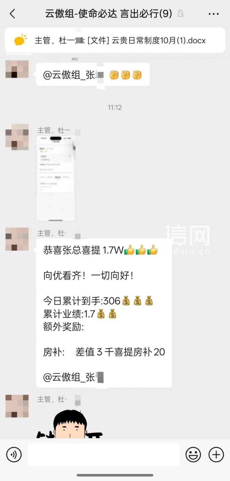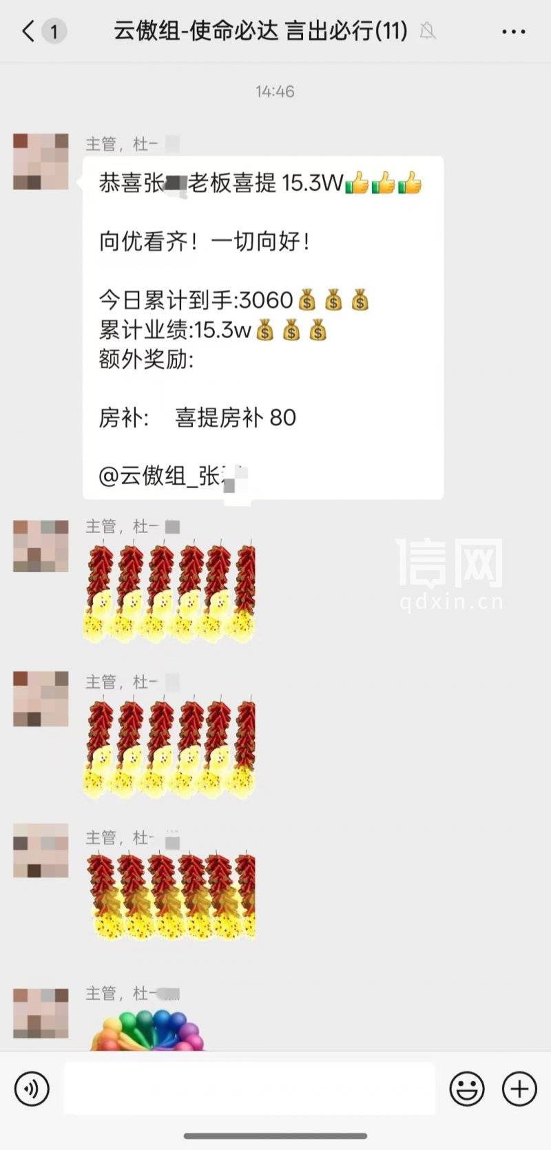 在企业微信群里,张先生被划在了“云傲组”,主管杜先生曾在“云傲组”工作群内发信息,通报张先生促成的一笔15.3万元业务,应得3060元提成外加80元房补,加上另外几笔业务提成,合计近5000元。这笔提成没有如约发放,张先生于10月8日离职,“我是与劳务派遣公司签订的合同,难以提供完整的劳动关系证明,我想要提成也屡屡碰壁。”