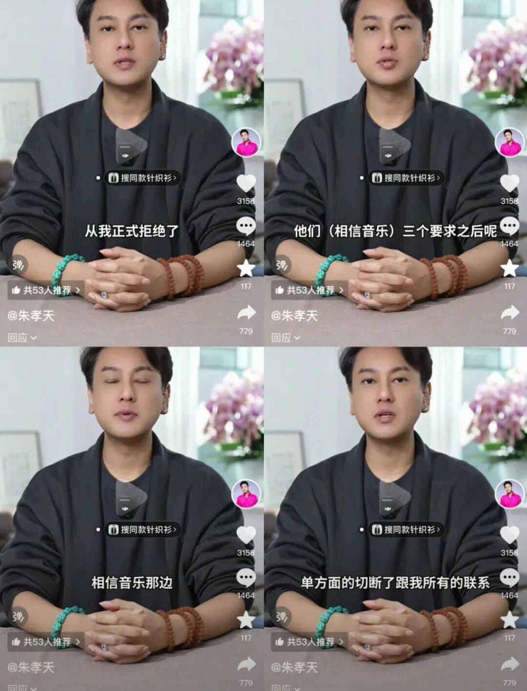 他透露,在几个月前拒绝了对方的三个要求后,“相信音乐”便单方面切断了与他的所有联系。随后,网络上才出现了因他“泄密”导致活动延期、乃至最终被移出团队的说法。朱孝天称,自己和大家一样,也是通过这些报道才得知被排除在此次活动之外,因此他将不会参与本次演出,对此他表示遗憾。
