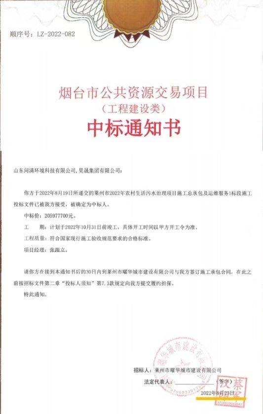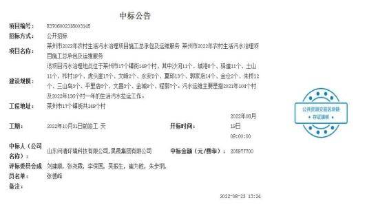 按公共资源交易网公示信息,项目2022年7月29日发布招标公告,8月19日开标,8月23日发出中标通知书,中标联合体为山东问清环境科技有限公司(下称“问清公司”)与昊晟集团有限公司,9月1日中标方与发包方签订正式合同。