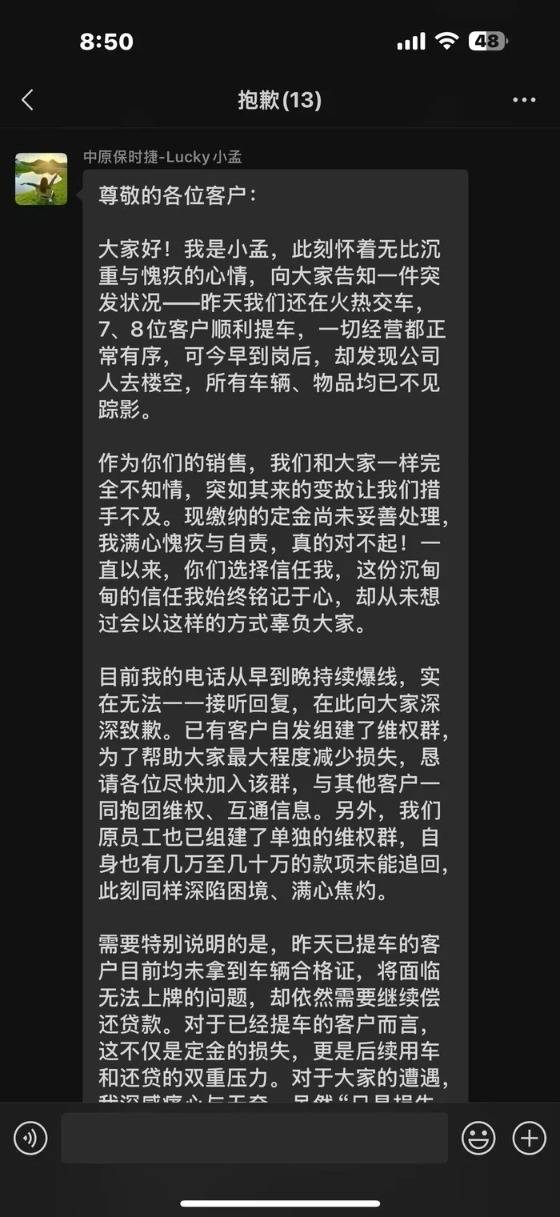 随着情况进一步发酵,一份由该店销售顾问“小孟”发送给客户的《致客户书》在多个车主维权群内流传。根据“小孟”的描述,12月22日门店仍处于正常经营状态,当天还有多位客户顺利提车。然而12月23日早晨员工到岗时,发现展厅车辆已被清空,公司高层失联,员工事前对此毫不知情。这一突如其来的变故使得已支付定金的消费者、近期提车但未拿到车辆合格证的车主,以及购买预充值服务的客户均陷入困境。