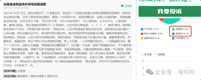 在监管部门与谷医堂交涉过程中,一位消费者展示的证据未被认可。黑猫投诉平台上关于谷医堂的投诉案例已达598条,诱导消费、虚假宣传等是主要问题。