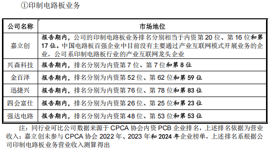 嘉立创“未参与CPCA协会2022年、2023年和2024年企业榜单”,其排名(内资第20、16、17位)系“根据公司印制电路板业务营业收入测算得出”。
