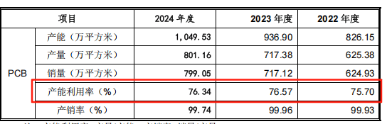 需要注意的是,2024年嘉立创PCB产量达801.16万平方米,但产能利用率始终徘徊在76%左右。在产能未饱和情况下,公司却计划通过IPO募资扩建年产800万平方米的PCB产线,相当于再造一个“嘉立创”。