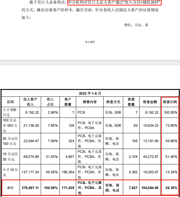 而主承销商国泰海通与嘉立创的合作并非无缝衔接。公开资料显示,该券商在电子产业领域虽有布局,但与此前保荐的半导体项目相比,对嘉立创的财务核查比例明显偏低:对自然人客户抽样率仅5.09%,对法人客户函证确认比例不足50%。