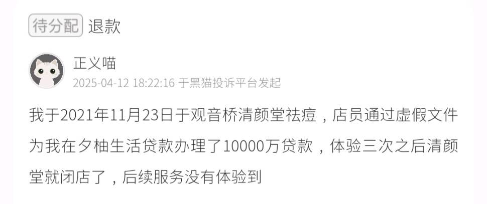 在黑猫投诉平台上,不少消费者都反馈了类似问题。2025年4月12日,一名消费者称2021年11月23日在观音桥清颜堂祛痘,被店员用虚假文件在“夕柚生活”平台办理1万元贷款,仅体验3次门店便闭店,剩余服务落空。