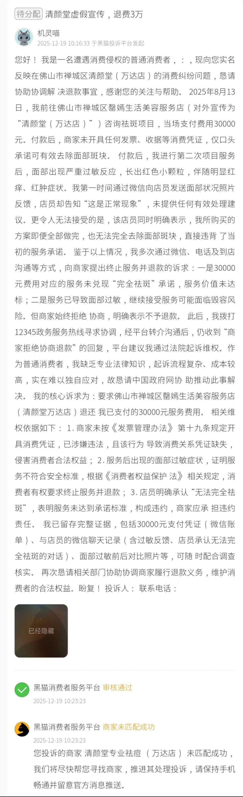 12月19日,黑猫投诉平台有消费者反馈称,其于8月13日前往佛山市禅城区馨妈生活美容服务店(对外宣传为清颜堂万达店)咨询祛斑项目而引发的一系列纠纷。