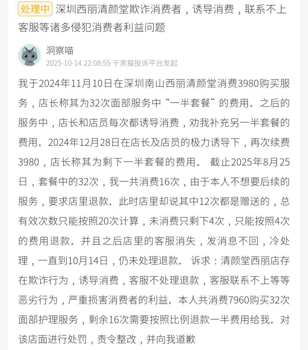 10月14日,平台另一位消费者投诉称,其于2024年11月10日在深圳南山西丽清颜堂消费3980元购买服务,该机构店长称其为32次面部服务中“一半套餐”的费用,此后每次服务过程中该机构店长及店员均持续诱导该消费者补充支付另一半套餐费用,直至2024年12月28日该消费者再次续费3980元,店长称此为剩余一半套餐费用。