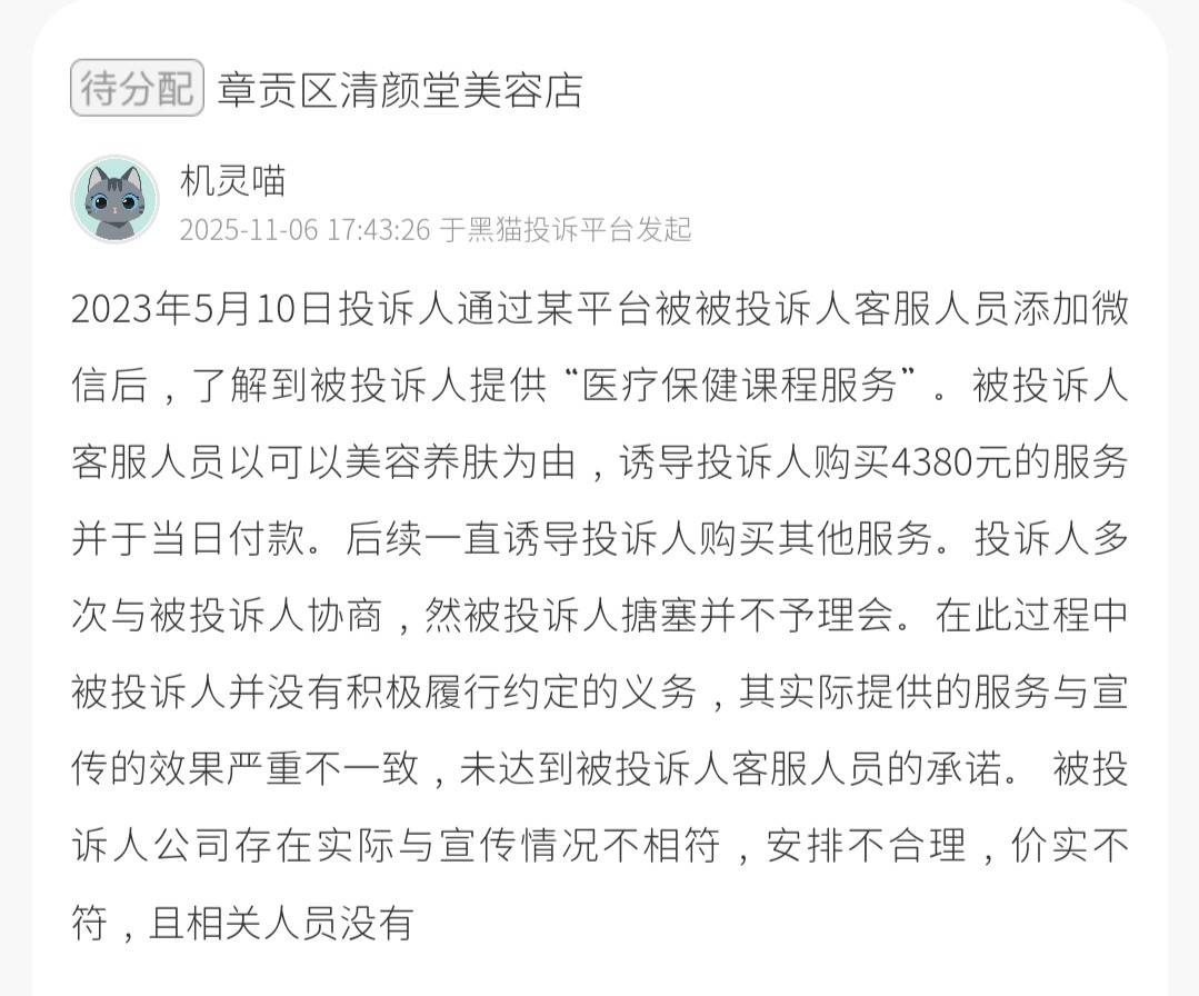 11月6日,有消费者投诉章贡区清颜堂美容店,该消费者称,其于2023年5月10日通过某平台被该机构工作人员添加微信后,了解到该机构提供所谓“医疗保健课程服务”,随后该机构工作人员以可美容养肤为由,诱导该消费者当日付款4380元购买服务,并在此后持续诱导其购买其他项目。