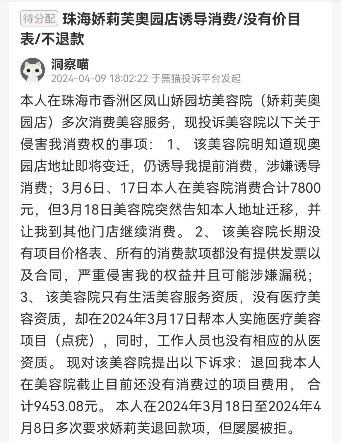 2024年4月9日,一消费者投诉称,其在珠海市香洲区凤山娇园坊美容院(娇莉芙奥园店)多次消费。