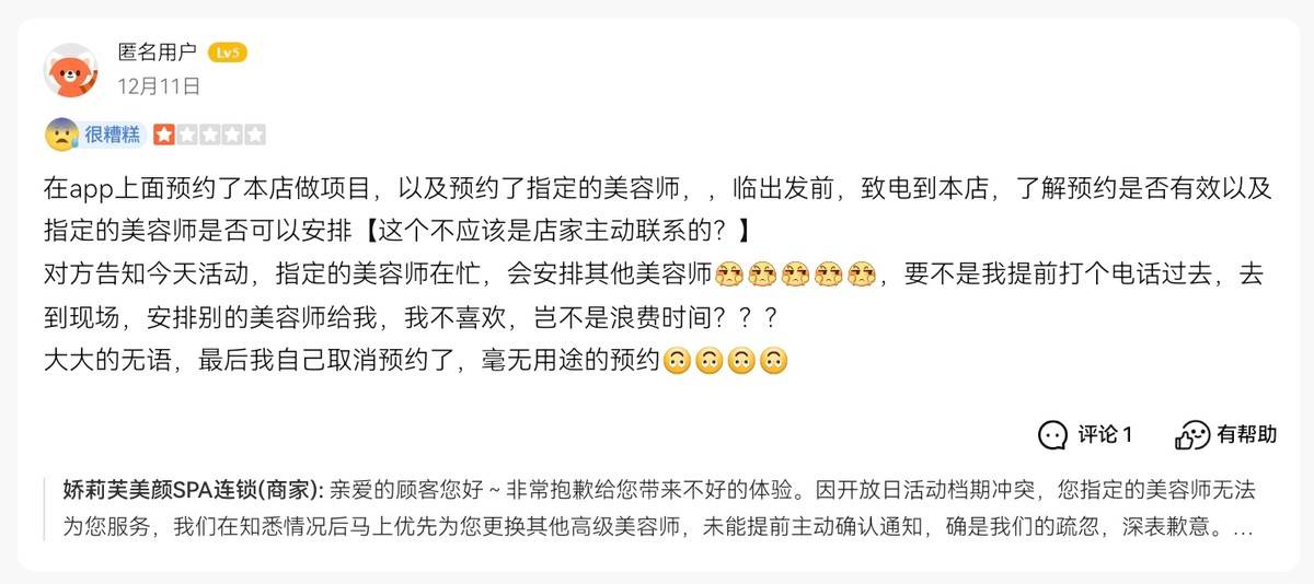 12月11日,有消费者给出差评称,该消费者在app上预约项目和指定的美容师,在出发前致电了解了预约是否有效以及指定的美容师是否可以安排。消费者被告知当天有活动,指定的美容师在忙,会安排其他美容师,该消费者觉得要不是自己提前打电话过去,去到现场才被告知安排别的美容师,自己不喜欢的话,岂不是浪费时间?最后该消费者自己取消了预约,觉得这是个毫无用途的预约。