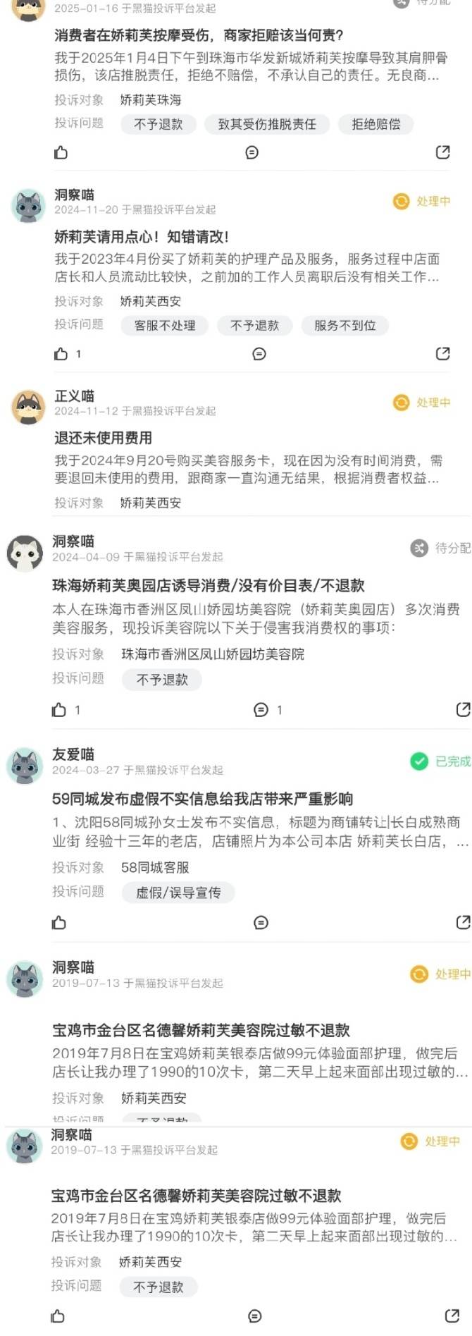 黑猫投诉和消费保平台显示,自2019年至今,娇莉芙在国内多地经营的门店都存在不同程度的投诉,消费者的投诉主要集中在虚假宣传、退款纠纷、消费过程中受伤等现象。对于大多数消费者的维权诉求,娇莉芙大多数未予以及时回复。
