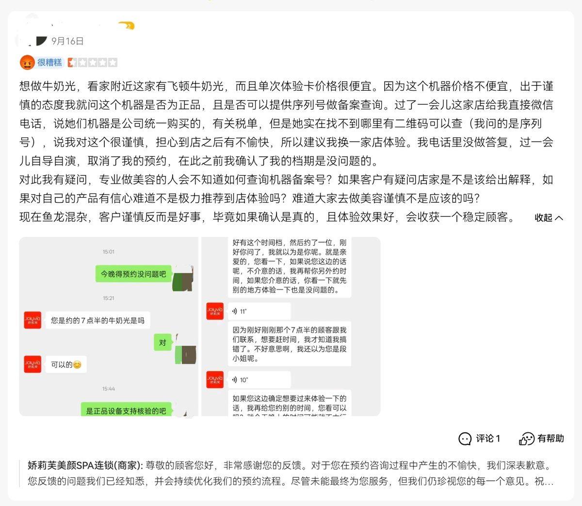 9月16日,一消费者也给出差评称,该消费者想做牛奶光,看到附近这家门店有飞顿牛奶光,且单次体验卡价格很便宜。但因为该机器价格不便宜,该消费者就问这个机器是否为正品,且是否可以提供序列号做备案查询。随后得到回复称机器是公司统一购买的,有关税单,但店里实在找不到哪里有二维码可查,还表示该消费者对此很谨慎,担心到店后有不愉快,故建议该消费者换一家店体验。该消费者电话里未做答复,随后工作人员自主取消了该消费者的预约,而在此之前该消费者已确认预留了自己的消费档期。