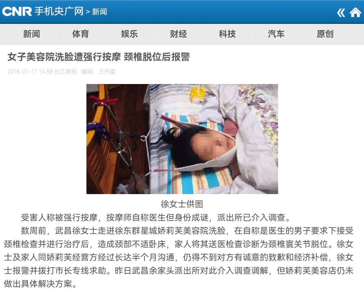 文章中提到,2015年12月,武汉市民徐女士在武昌徐东群星城的娇莉芙美容院接受面部护理时,被店内自称“朱医生”的员工以检查颈椎为由强行按摩,导致颈椎寰枢关节脱位。徐女士事后卧床半月,需每日牵引治疗,但美容院拒绝道歉及赔偿,最终引发法律纠纷。