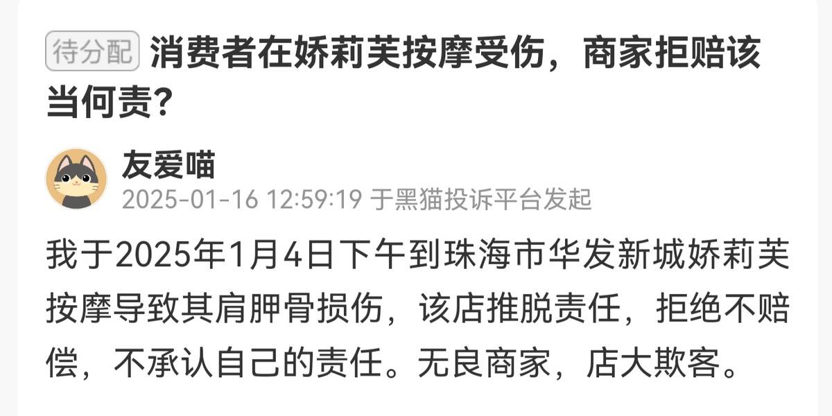 1月16日,一位消费者在黑猫投诉平台上进行投诉,该消费者称其于1月4日下午,在珠海市华发新城娇莉芙进行按摩,结果导致其肩胛骨损伤,该机构推脱责任,拒不赔偿。该消费者称该机构为无良商家,存在店大欺客情况。