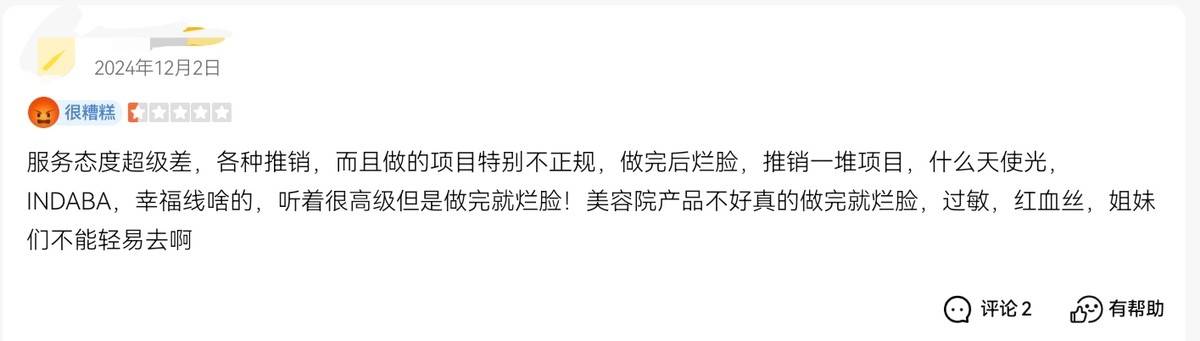 2024年12月2日,一位消费者指出,该机构服务态度超级差,存在各种推销行为,且所做项目特别不正规,做完后出现烂脸情况。推销了众多项目,如天使光、INDABA、幸福线这类听起来很高级的项目,做完后却导致烂脸。
