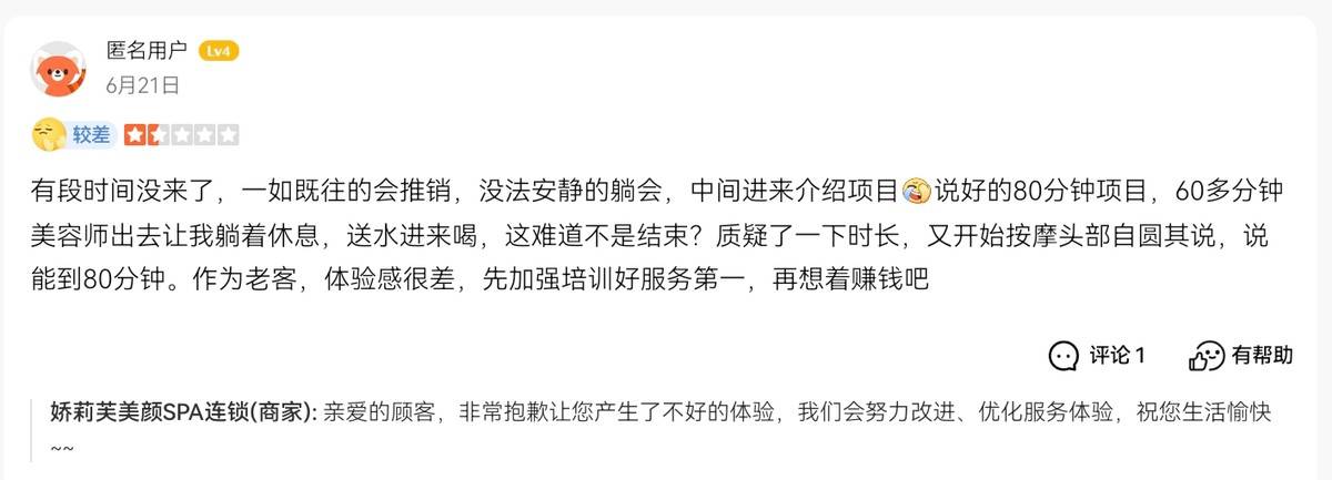 6月21日,有该机构的回头客给出差评称,有段时间没来这家店了,店里一如既往会推销,导致自己没法安静躺下休息。项目承诺80分钟,但60分钟后美容师便离开。当该消费者质疑项目没到承诺时间就结束后,美容师又开始按摩其头部并表示可以达到80分钟。作为老客,该消费者觉得体验感很差,希望店家先加强培训把服务放在第一位,再考虑赚钱。