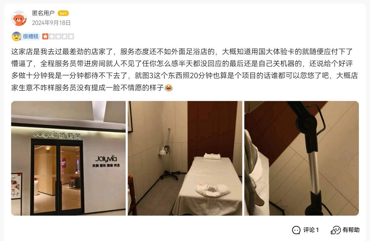 2024年9月18日,有消费者评论称,该机构是其去过最差劲的店家,服务态度还不如外面足浴店。消费者认为,大概是因为工作人员知晓其使用的是体验卡,就随便应付。