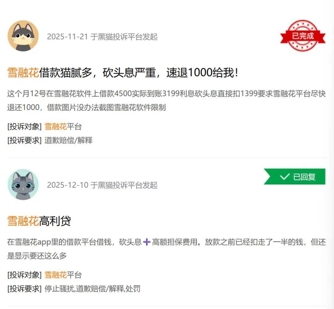 近日,在黑猫投诉上,多名用户投诉在雪融花借钱遭遇砍头息,且购物才能放款。