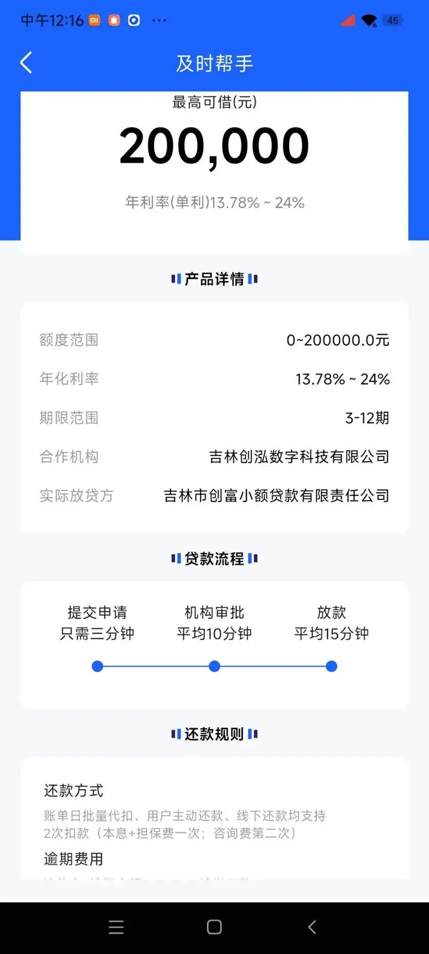 页面信息显示,及时帮手最高可借20万,年化利率13.78%—24%,合作机构为吉林创泓数字科技有限公司,实际放款方为吉林市创富小额贷款有限责任公司。