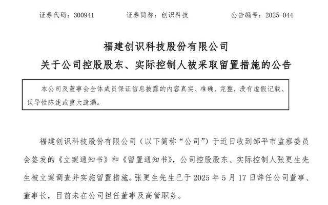 12月22日晚,福建创识科技股份有限公司(以下简称“创识科技”)公告称,于近日收到邹平市监察委员会签发的《立案通知书》和《留置通知书》,公司控股股东、实际控制人张更生被立案调查并实施留置措施。创识科技表示,公司拥有完善的治理结构及内部控制机制,将按照法律法规和相关制度规范运作,日常经营管理由公司高管团队负责,上述事项不会对公司的生产经营管理情况产生重大负面影响。