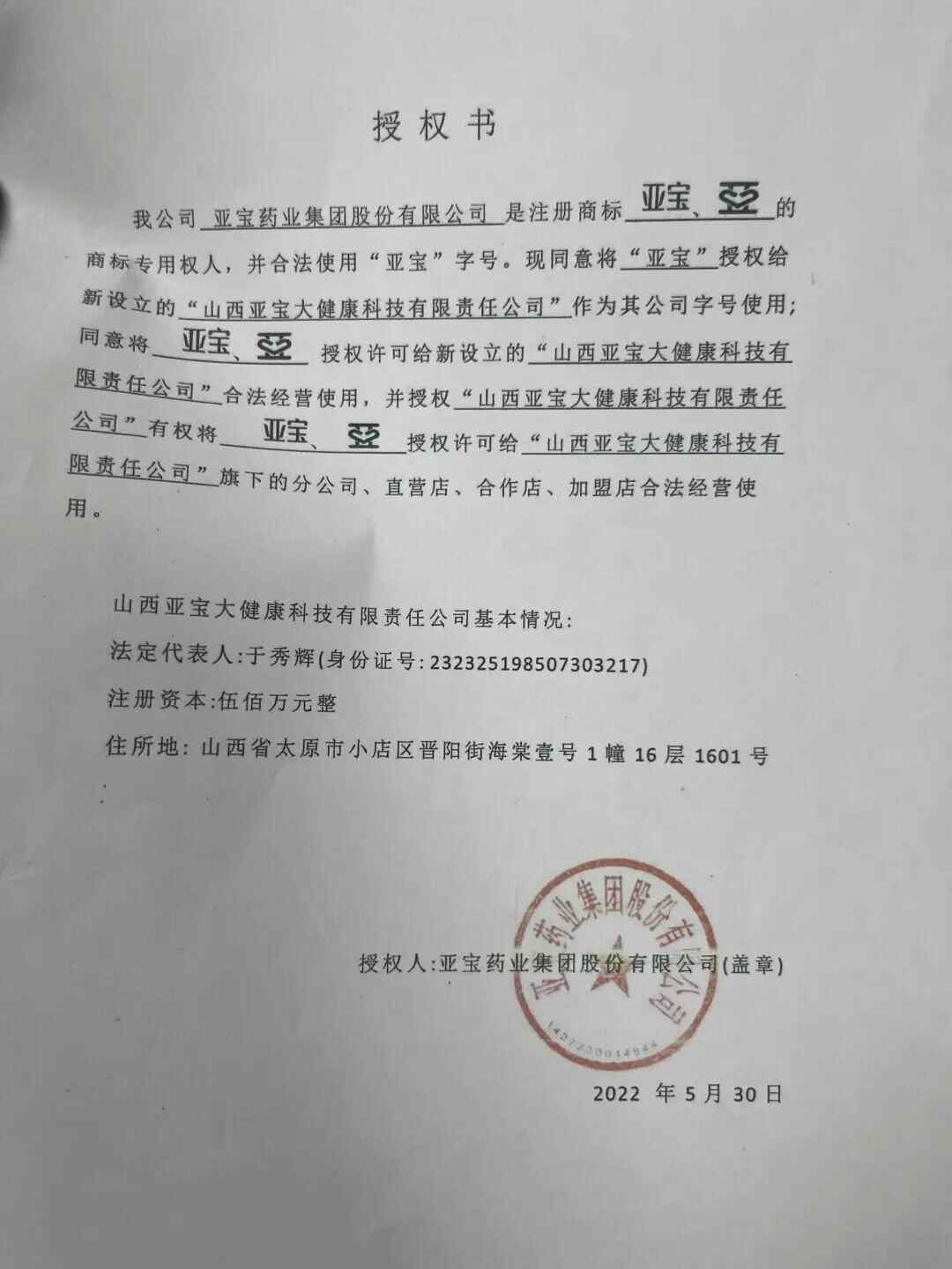 亚宝大健康给门店的“授权书”