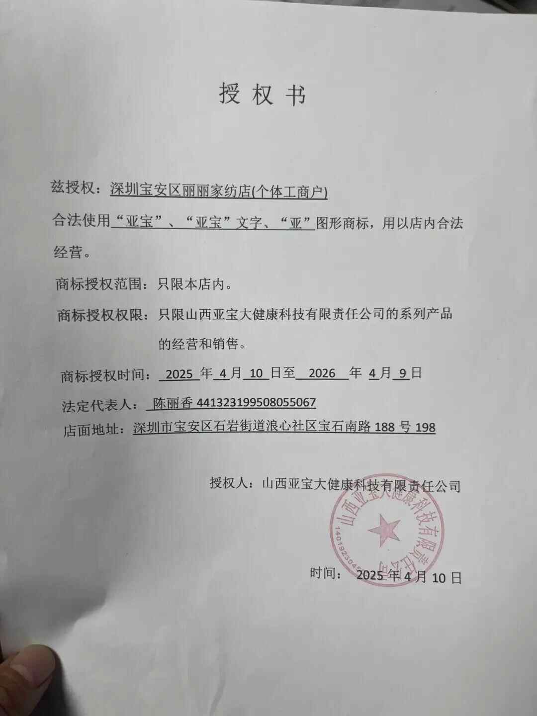 店内出示的授权书显示:亚宝药业集团股份有限公司将“亚宝”授权给“山西亚宝大健康科技有限责任公司”,后者又授权给“深圳市宝安区丽丽家纺店”使用。