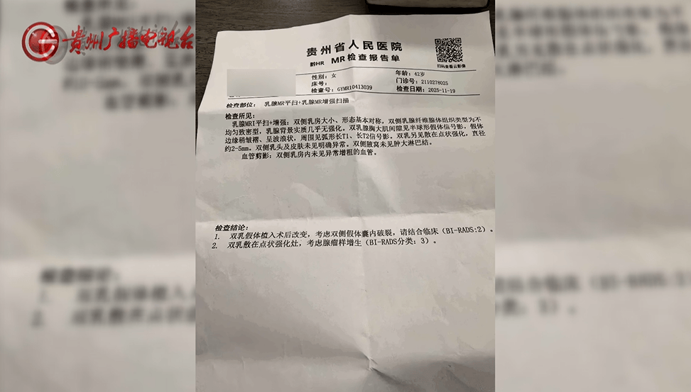 之后,晏女士来到贵州省人民医院检查,核磁共振报告显示“考虑囊内破裂”。对此利美康医院却不完全认同检查结果,对方要求宴女士取出假体鉴定。这下,晏女士对利美康彻底没了信任,甚至还产生了新的怀疑。