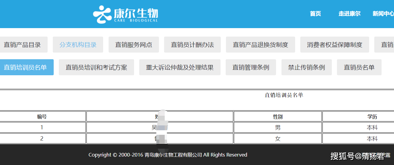 值得注意的是,康尔生物持有商务部颁发的直销许可证,获批直销区域仅限青岛、广州等地共30个服务网点,直销产品为2类10种,还有1个直销培训员(在册1个,注销8个)。而康尔生物官网显示有2个直销培训员。清扬君猜测,康尔生物或许是因事务繁忙而未及时更新网站,但这在一定程度上也反映出其在管理能力上的不足。