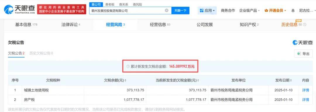 天眼查公开信息显示,2025年1月10日,国家税务总局霸州市税务局南孟税务分局披露,霸州发展控股存在城镇土地使用税、房产税欠缴情形,两项欠税余额分别为37.31万元、107.78万元,合计欠税145.09万元,且两项欠税均被明确标注为“当前新发生的欠税金额”。此次新增欠税加剧市场对其长期税务合规性的担忧。