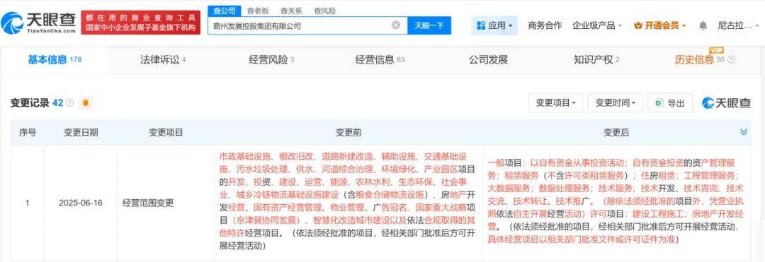霸州发展控股成立于2002年6月,注册资本50亿元,成立以来历经多次名称变更。2025年6月,公司经营范围由“市政基础设施、棚改旧改、道路新建改造等”变更为“自有资金从事投资活动、资产管理服务、大数据服务、数据处理服务等”,许可项目包含建设工程施工及房地产开发经营。