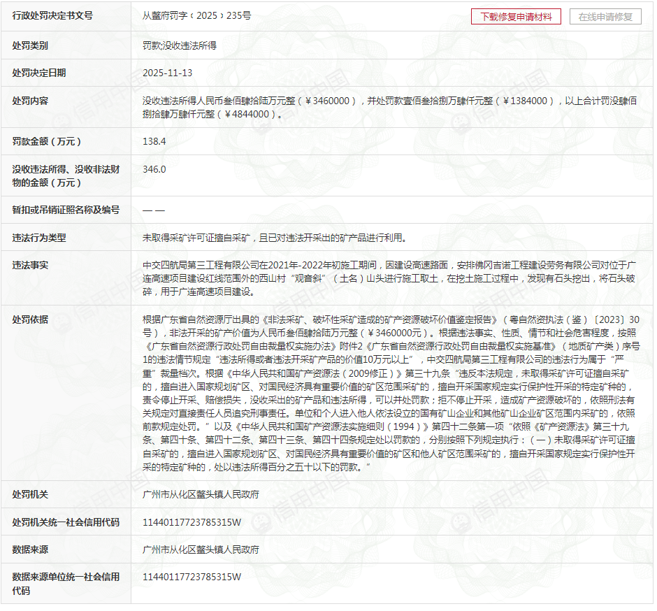 行政处罚决定书文号从鳌府罚字﹝2025﹞235号显示,中交四航局第三工程有限公司在2021年-2022年初施工期间,因建设高速路面,安排佛冈吉诺工程建设劳务有限公司对位于广连高速项目建设红线范围外的西山村“观音斜”(土名)山头进行施工取土,在挖土施工过程中,发现有石头挖出,将石头破碎,用于广连高速项目建设。
