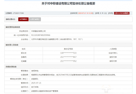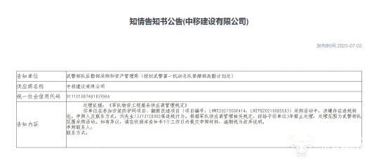 据公告显示,中移建设公司在参加安装防护网项目、翻新改造项目采购活动中,涉嫌存在违规失信行为,即涉嫌违规转包,现已暂停其参加某部队范围物资工程服务采购活动资格,并拟给予3年禁止处理。
