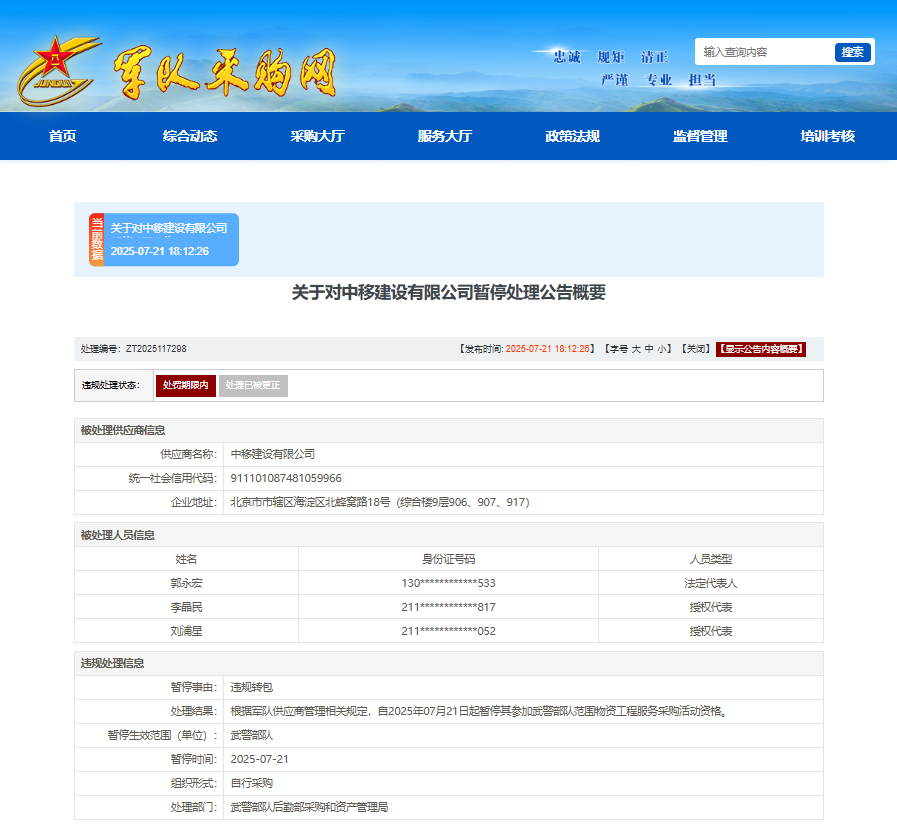 近日,齐鲁晚报·齐鲁壹点记者从军队采购网获悉,中移建设有限公司因违规转包,于2025年7月21日被暂停其参加武警部队范围物资工程服务采购活动资格。