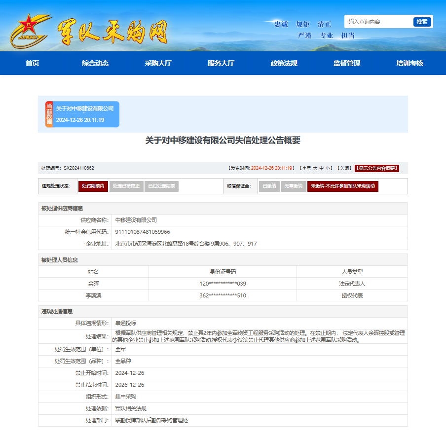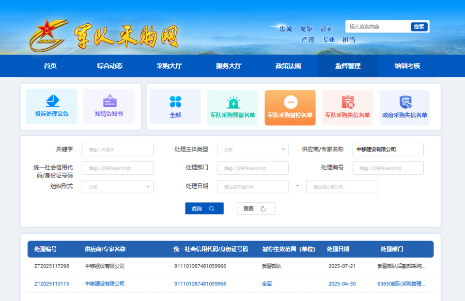 中移建设有限公司违规转包再次被禁:多次在军队采购中违规