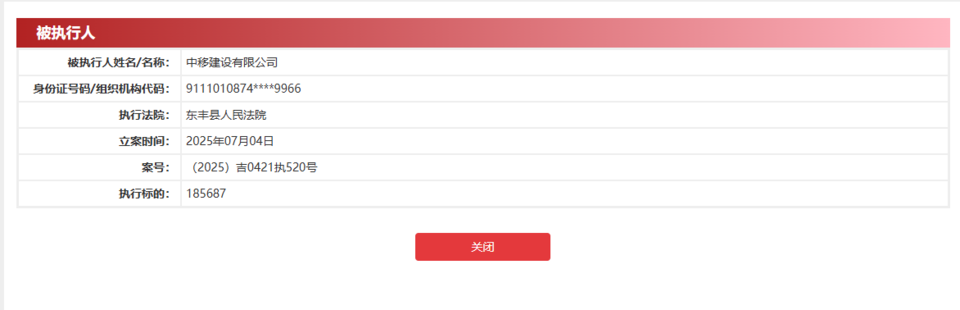 中国执行信息公开网显示,2025年7月4日,中移建设有限公司有一条被执行信息,执行标的185687元。