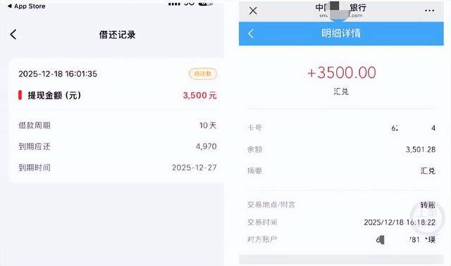 据上游新闻,12月25日,河北承德市民宫先生向记者反映,其在苹果应用商场下载的一款借款App,在未经过审核的情况下即被“强制放款”,放款金额为3500元,10天后需还4970元,且资金来源为私人账户。