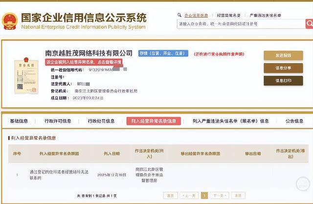 查阅国家企业信用信息公示系统看到,该公司已被列入经营异常名录,原因系“通过登记的住所或经营场所无法联系”,并有“正在进行营业执照作废声明”提示。