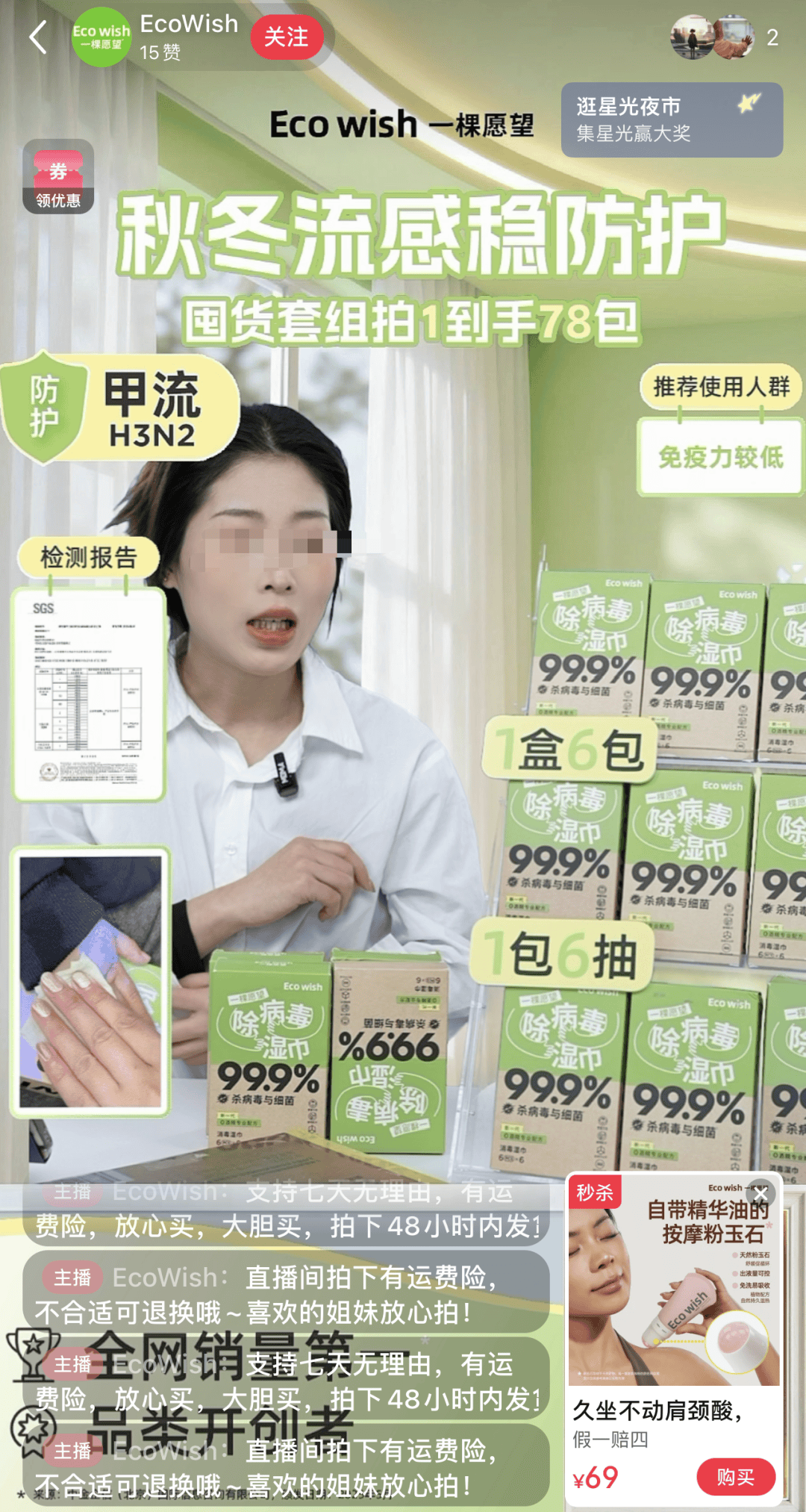 根据李女士反馈的线索,记者进入某社交平台的EcoWish旗舰店直播间,主播在推荐“Eco wish一棵愿望除病毒湿巾”时提及,“现在流感病毒到处都是,家里有老人、小孩的必须囤!出门擦手、擦脸,一擦就能灭活流感病毒,随身携带特别方便”,并展示产品包装,包装上“除病毒湿巾,99.9%杀病毒与细菌”的字样清晰可见。直播间背景板上“秋冬流感稳防护,防护甲流H3N2”的字样醒目。
