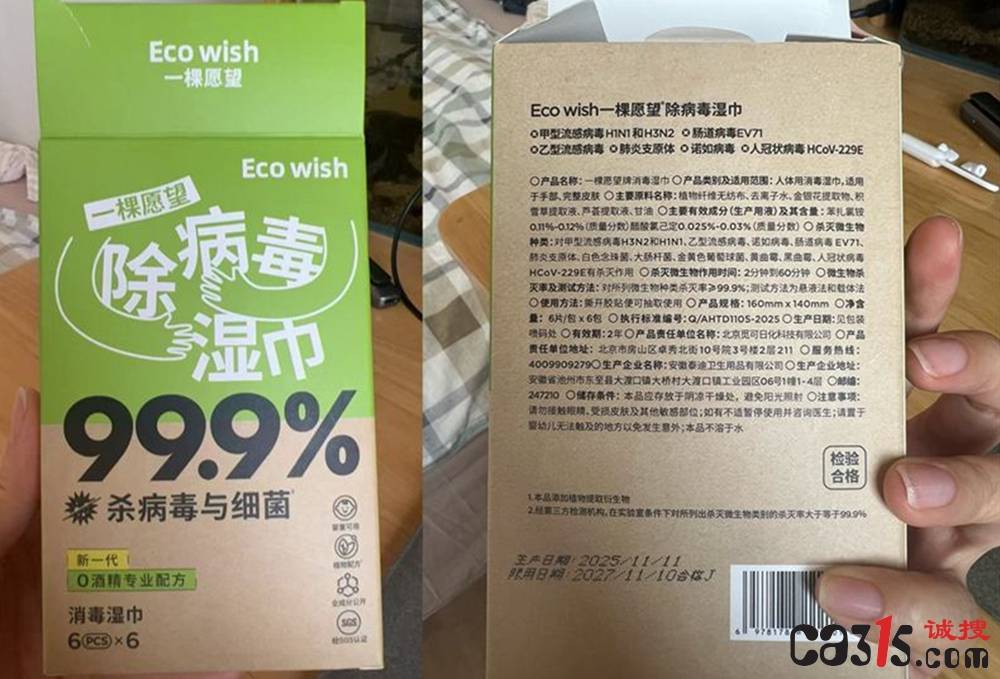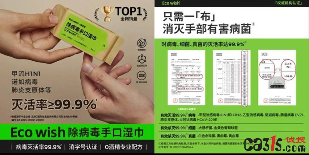 315曝光:“Eco wish一棵愿望除病毒湿巾”产品宣传疑点重重