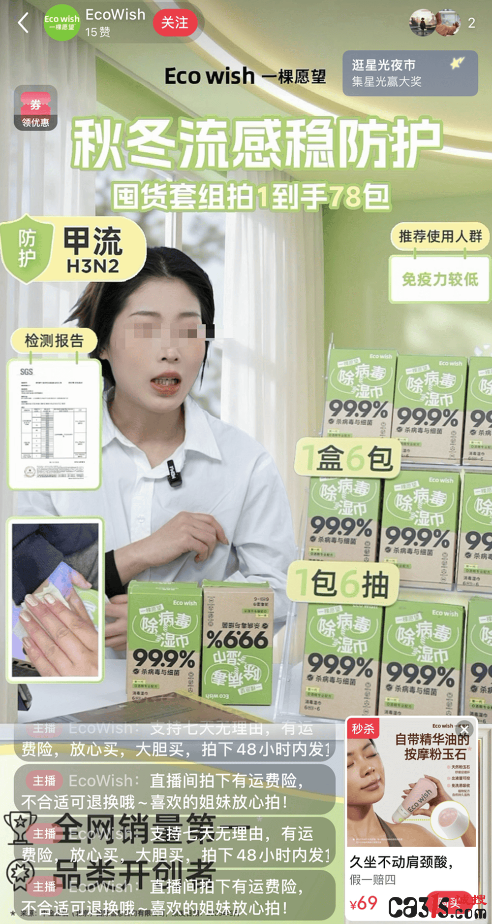 EcoWish旗舰店直播间,主播正在介绍“Eco wish一棵愿望除病毒湿巾”的“防病毒”功效。