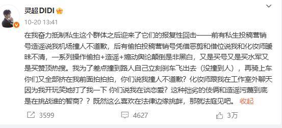 10月,灵超曾喊话私生粉法庭见,称被私生粉报复性回击,包括偷拍、造谣、煽动舆论颠倒是非黑白等。