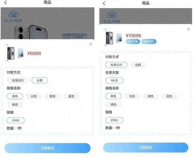 记者测试发现,在金玉满堂上购物可选择全额支付或者先享后付。全额支付的商品价格更低;先享后付的商品价格更高,且先享后付根据商品类别不同先享天数不同,包括30天和184天等。