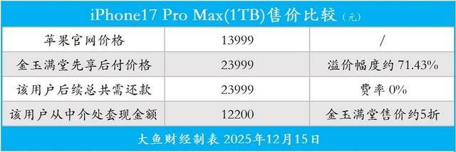 近日,一位用户在社交平台表示,在金玉满堂App通过先享后付方式购买了一款售价23999元的手机,但在苹果官网,该产品的售价仅为13999元,溢价幅度高达71.43%。