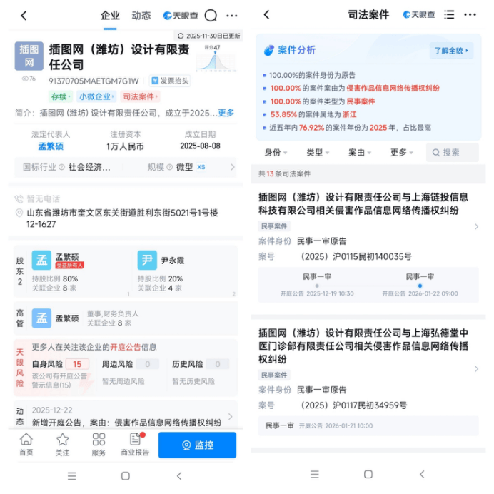 其关联企业插图网(潍坊)设计有限责任公司成立于2025年8月8日,已涉及13起同类侵权纠纷。