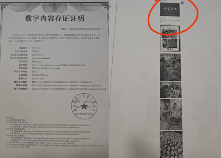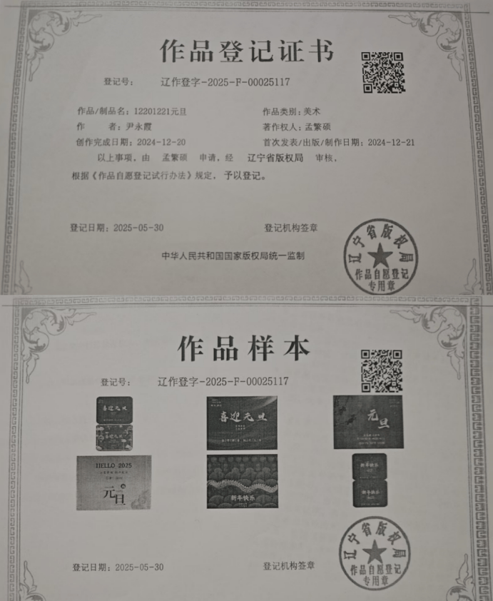但这份标注创作时间为2024年12月20日的“喜迎元旦”图片,版权登记日期却迟至2025年5月30日,登记机构为辽宁省版权局,明显存在“先取证、后登记”的反常操作。