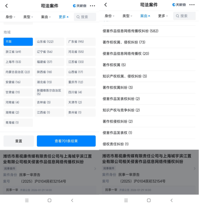 就是这样一家“小体量”公司,却展现出惊人的诉讼“战斗力”。截至目前,该公司累计涉及701条司法案件,遍布山东、广东、浙江、辽宁等全国24个省份。案由高度集中,其中侵害作品信息网络传播权纠纷582起、著作权权属及侵权纠纷73起,其余十余类均与知识产权相关,批量诉讼特征极为突出,维权范围与企业规模严重失衡。